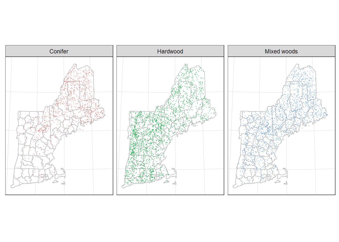 Using Forest Inventory and Analysis plots across the region (full condition plots from their most recent measurement), data were queried on mixedwoods across New England. Stands were labeled as being dominated by either conifers, hardwoods, or mixedwoods (defined as stands where neither the proportion of hardwoods or softwoods exceeded 75% of the total basal area).