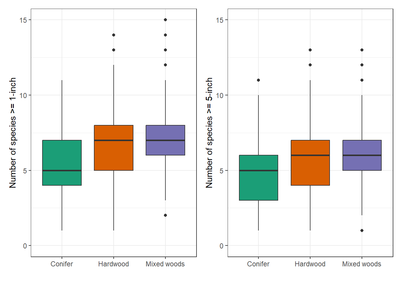 Mixedwoods are comparable to hardwood stands in terms of number of species. Average number of species greater than 5.0-inches on FIA plots was 6.1 and 5.6 species in mixedwoods and hardwood stands, respectively: