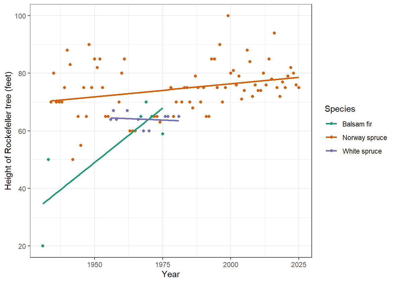 This year’s tree is 75 feet tall, quite similar to the long-term average of 72.3 feet (n = 94). The selected tree has generally become taller over time:
