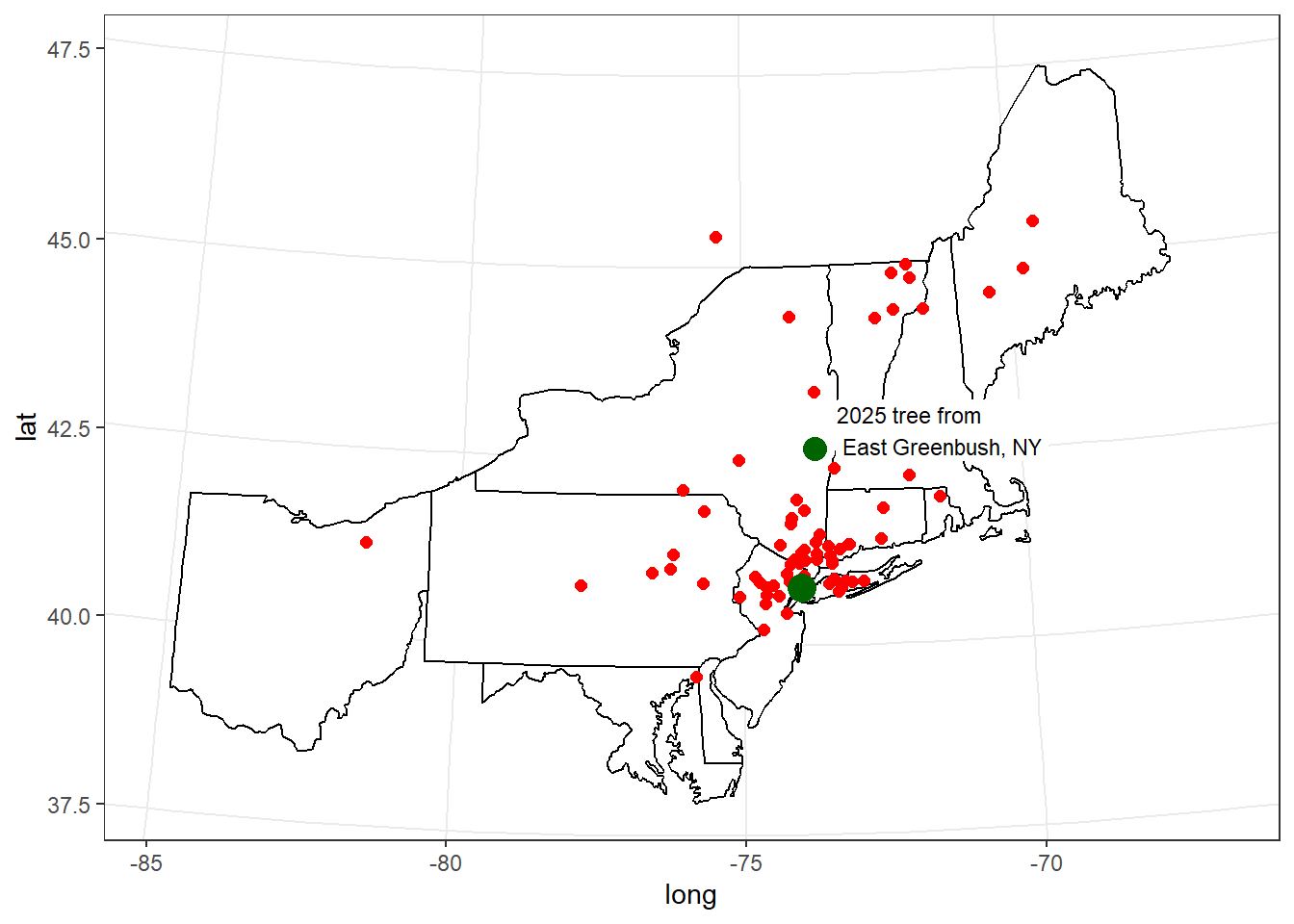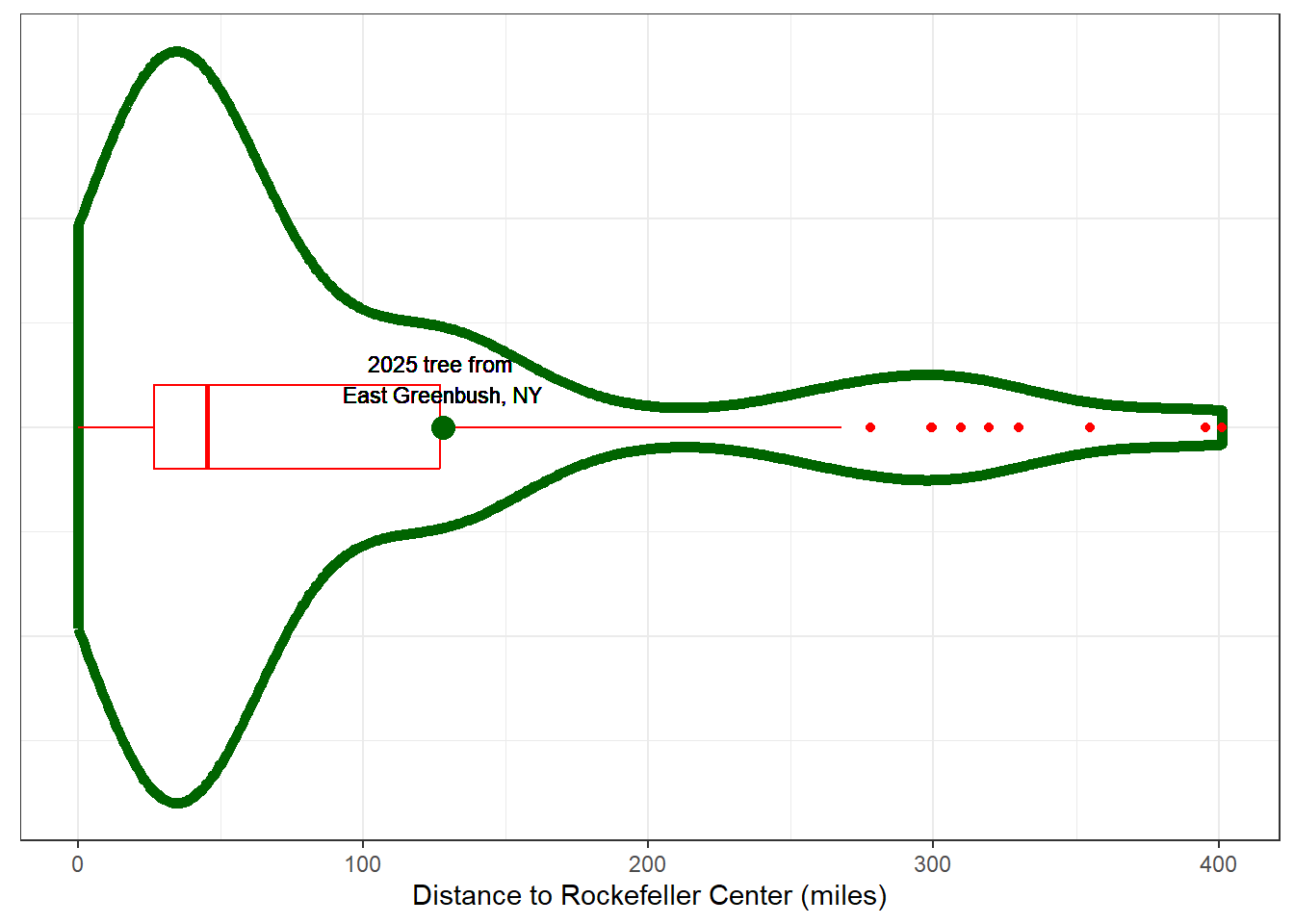 This year’s tree is in the 75 percentile of distance traveled to get to Rockefeller Center: