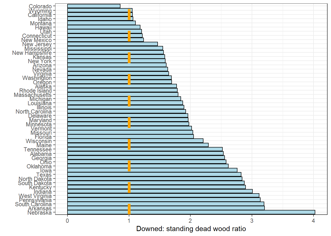The downed: standing dead wood ratio is a useful value that can be used to compare the two pools. Only one state, Colorado, shows a ratio less than one, indicating greater standing compared to downed dead wood. States that show the lowest ratios are located in the western US where recent large scale disturbances have lead to lots of tree mortality.