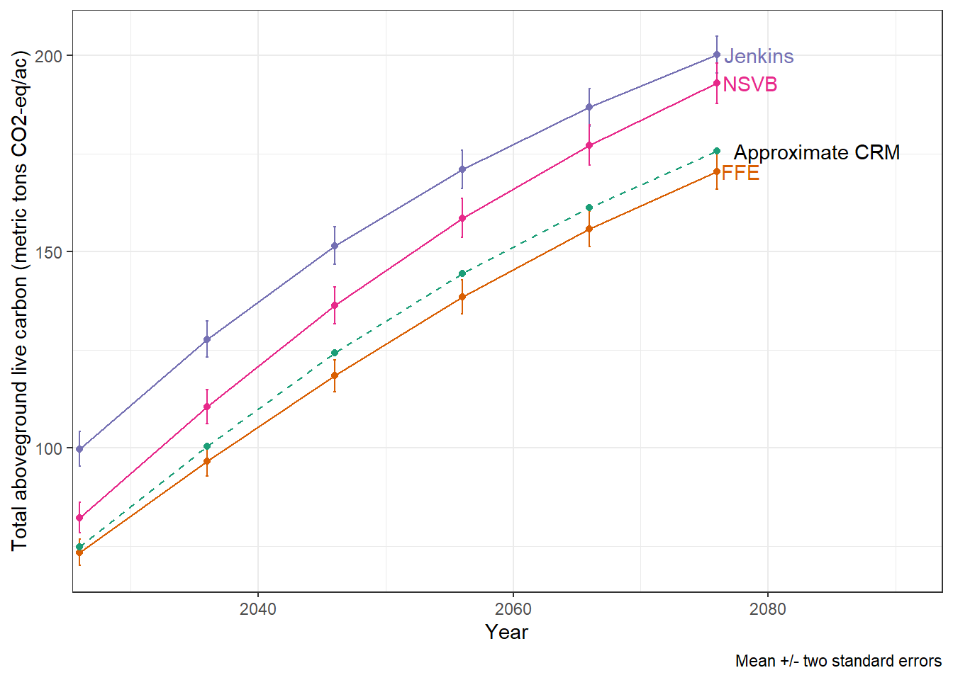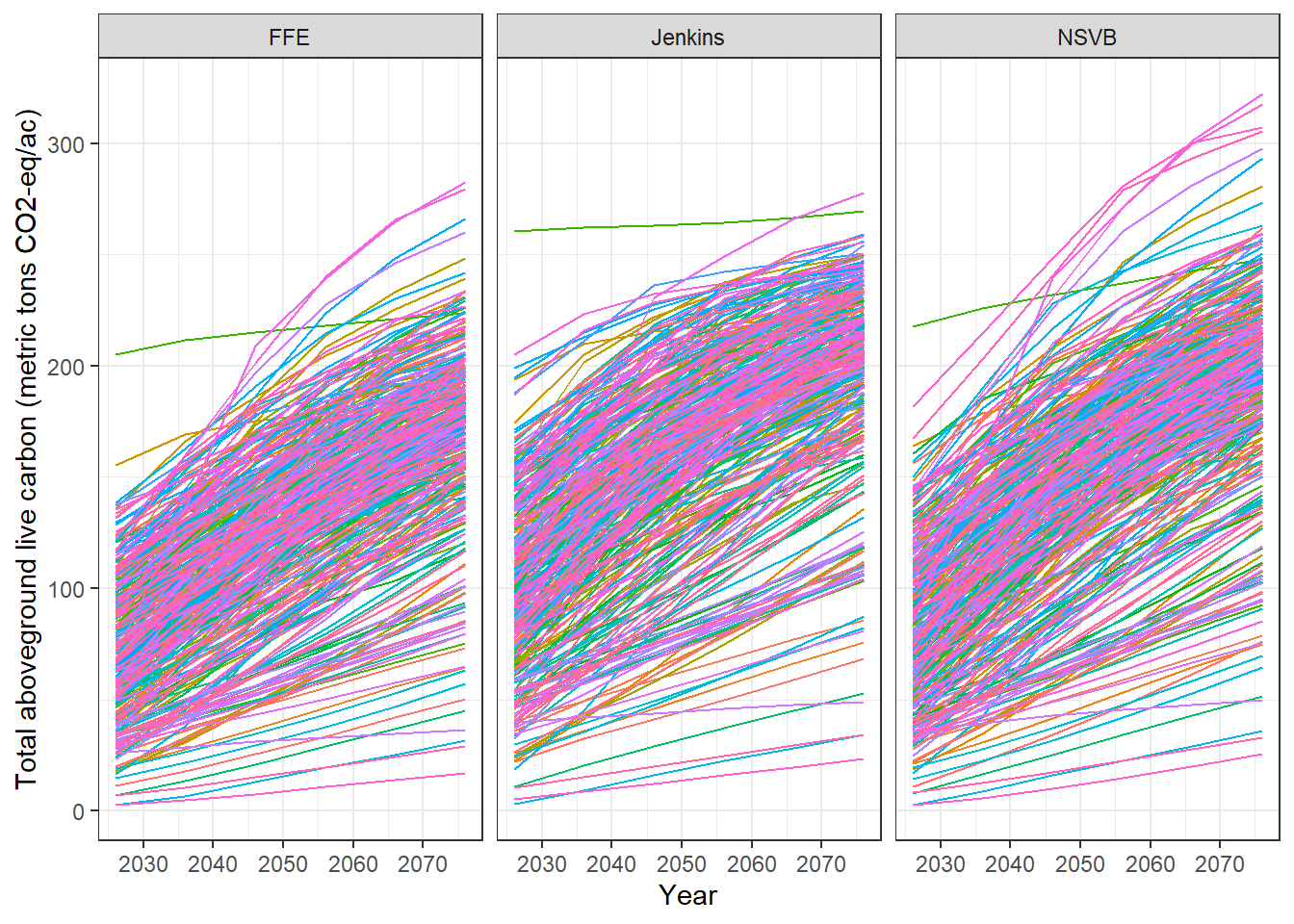 When averaged across all plots, Jenkins equations provided the greatest carbon storage, followed by NSVB, and then FFE. The difference between Jenkins and NSVB estimates was as high as 17% in 2026 (at the start of the simulation) and as low as 4% in 2076 (the end of the 50-year simulation). The decreasing difference in these two estimates as stands age requires more digging, but likely has something to do with tree height not being used in the Jenkins equations.