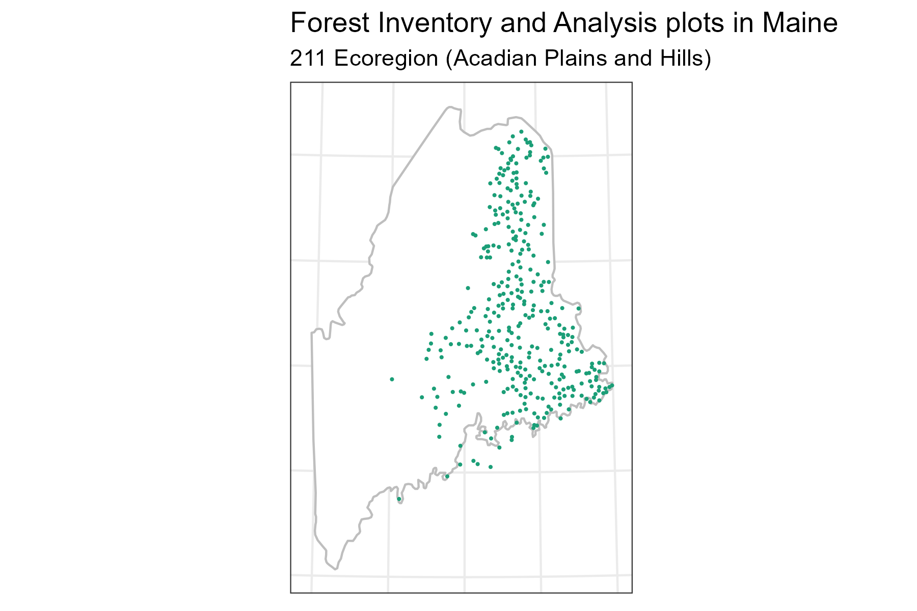 - ECOREGION: The ecological subsection code. Have a look at the map here for your ecoregion’s code. In the Maine data, this is ECOREGION = 211 for the Acadian Plains and Hills.